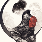 桜の美しい季節に、春風を感じる浮世絵の世界に佇む猫。和傘を差し、ブルーグリーンの色調が絵画にやさしい日本の風情を加えています。芸術と自然が融合した幻想的な一枚。 #浮世絵 #桜 #猫